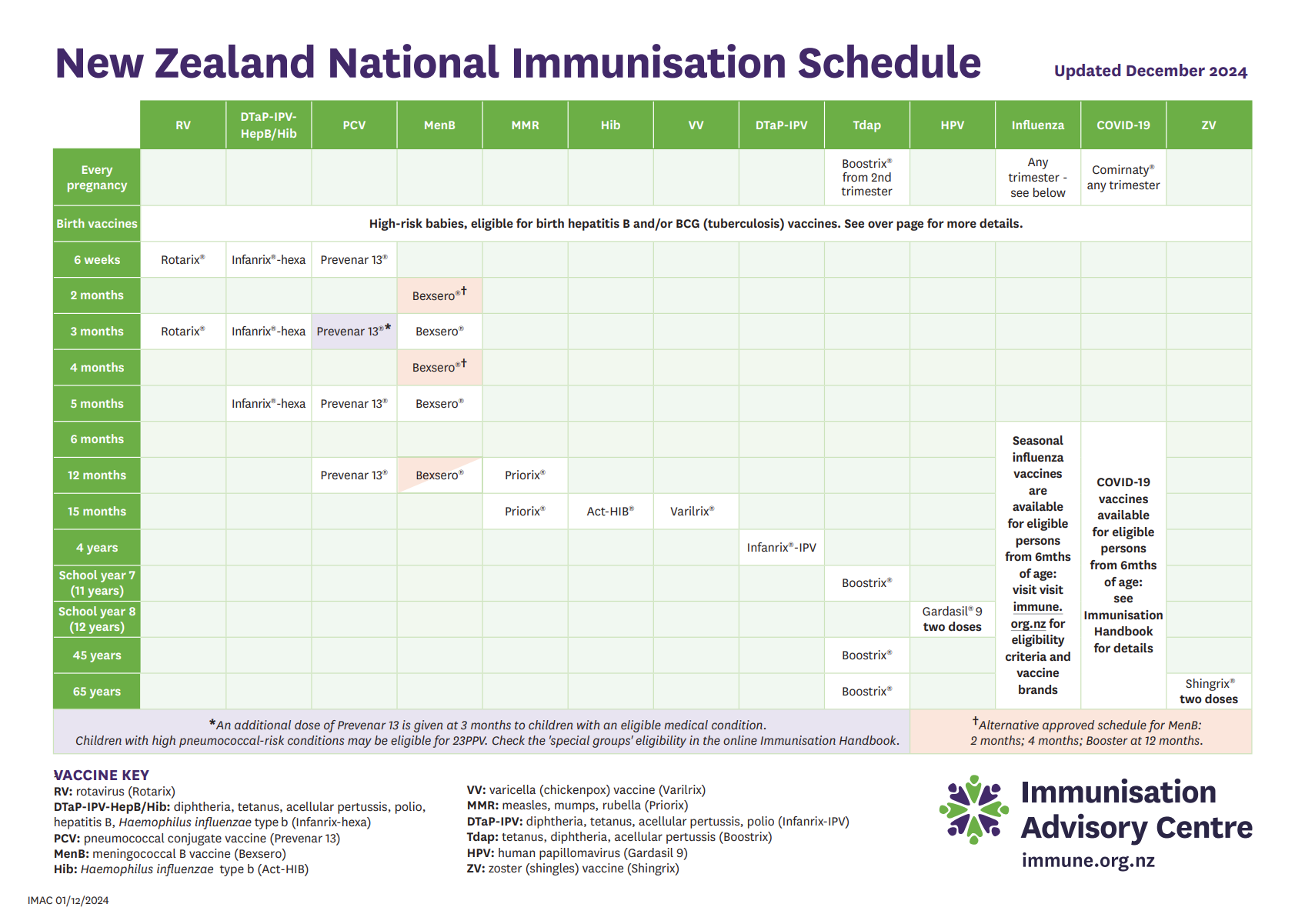 Source: The Immunisation Handbook, Ministry of Health | Manatū Hauora, New Zealand.